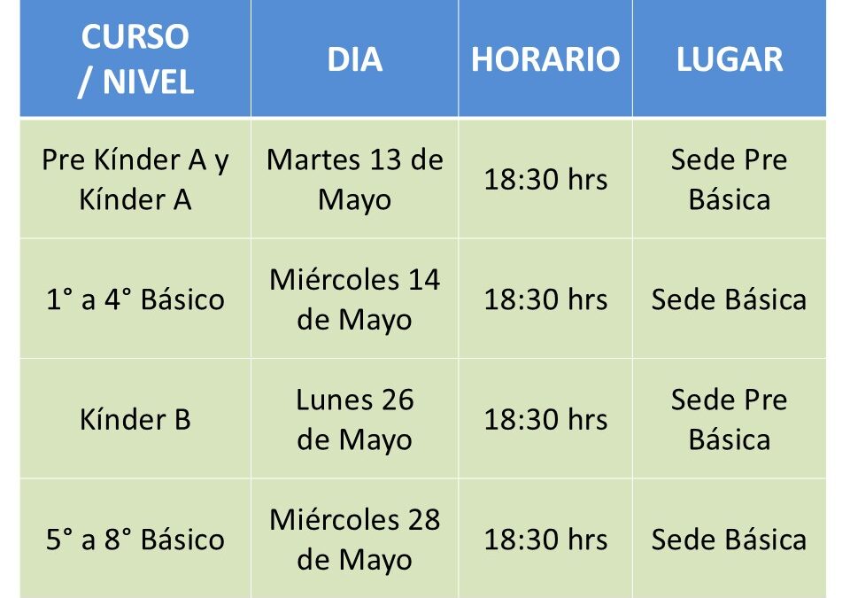 Lo anterior implica que el día miércoles 14 los estudiantes de 1° a 4° básico saldrán de clases a las 17:50 hrs para que así los apoderados puedan llegar a tiempo a la reunión.