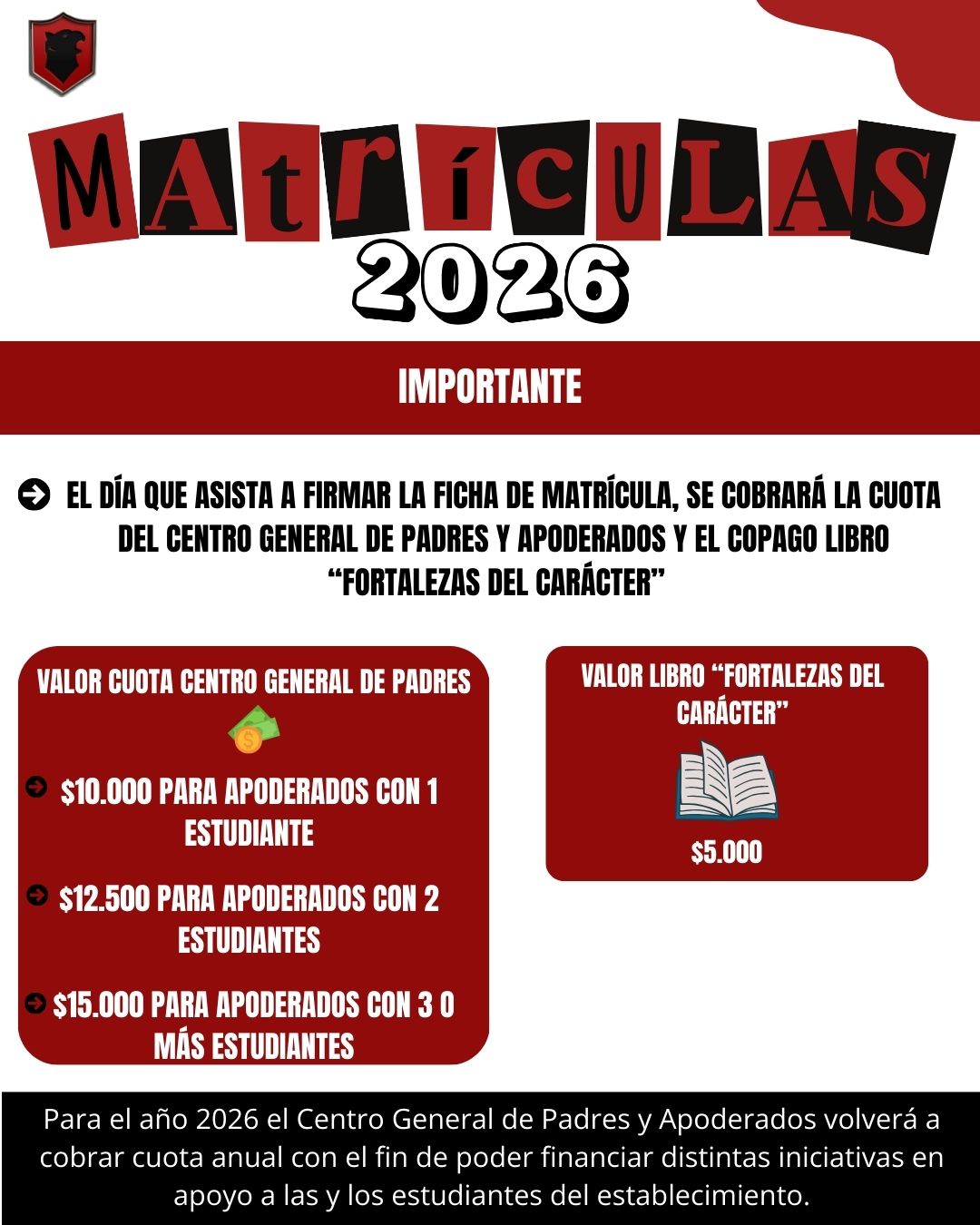 Ese mismo día deberá pagar la cuota del centro general de padres y apoderados cuyo monto es de: 1 niño $10.000, 2 niños $12.500 y 3 niños o más $15.000. Además, debe pagar Copago Libro Fortalezas del Carácter 2026 de $5.000 por estudiante.