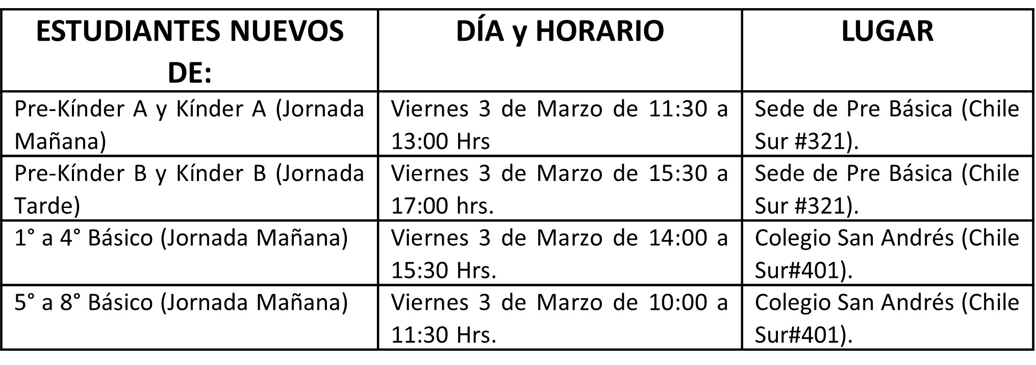 Estimados/as estudiantes y apoderados que se incorporan este año 2023 a nuestro establecimiento. Con el fin de poder acompañar y guiar su incorporación a nuestro establecimiento, realizaremos jornadas de inducción con Estudiantes y sus Apoderados en los siguientes niveles, día y horario: