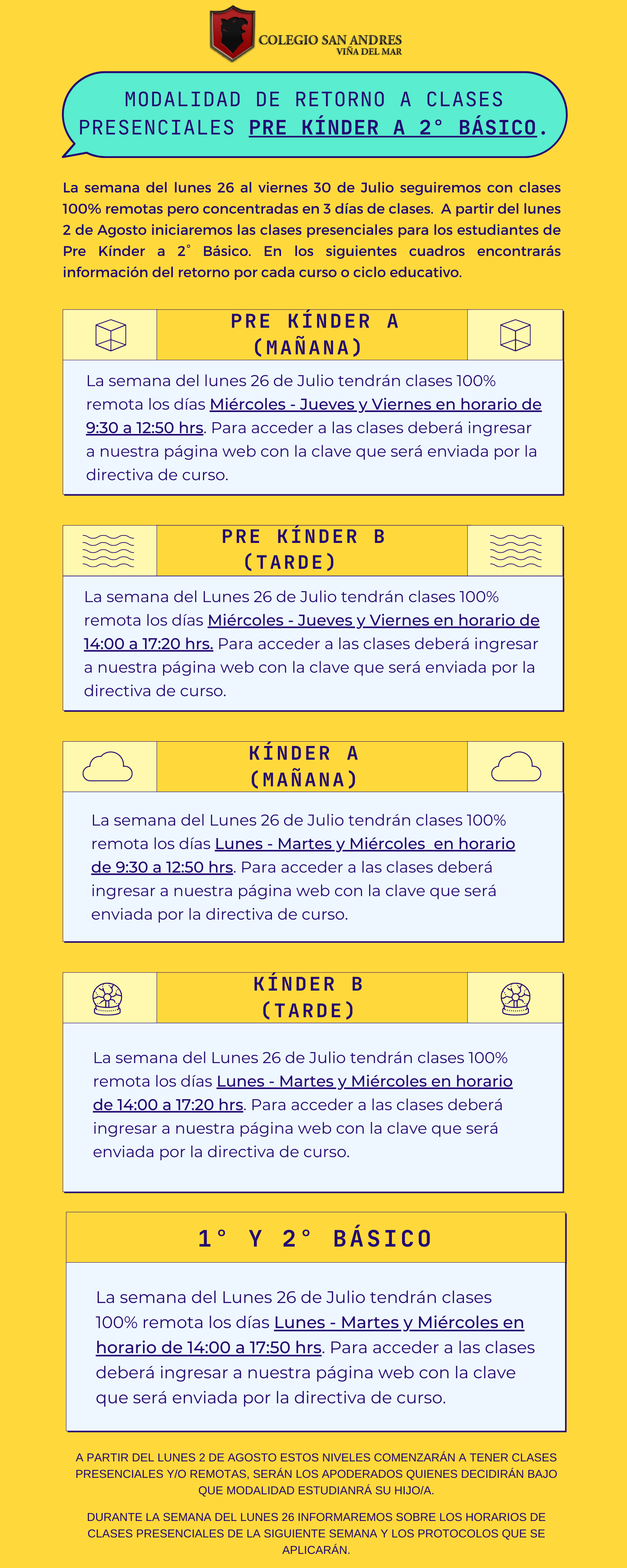 Información sobre modalidad y fechas retorno a clases Presenciales Pre Kínder a 2° Básico
