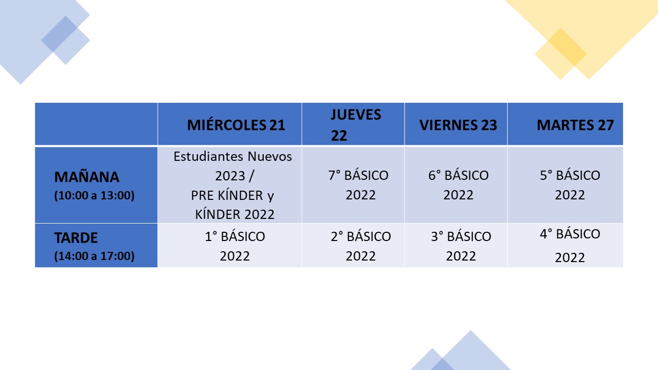 Lunes 6 de Marzo: Inicio de clases para todos los estudiantes del establecimiento (Antiguos y nuevos). Se publicará, a fines del mes de Febrero, los horarios de clases de la primera semana de Marzo 2023.
