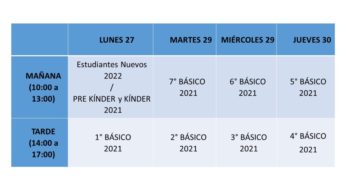 4- Respecro de la fecha de Inicio de Clases 2022: En relación al inicio de clases, la fecha definida por el Ministerio de Educación es el día Miércoles 2 de Marzo 2022. Nosotros como Colegio realizaremos un ingreso a clases diferido de la siguiente manera: